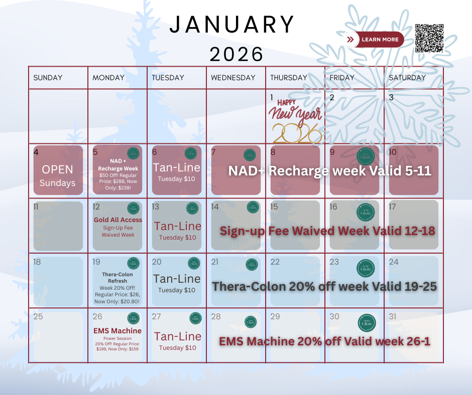 - NAD Recharge Week (Jan 5 – Jan 11) Kick off the year with a boost! Enjoy a $50 discount on our NAD Recharge service, reducing the regular price from $289 to just $239. Feel revitalized and ready to take on new challenges.